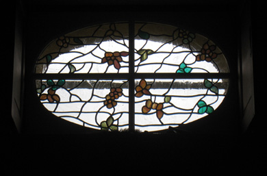 Les vitraux en place. Le graphisme des plombs, les coloris des fleurs et feuilles, la texture de verres blancs concourrent au résultat final.